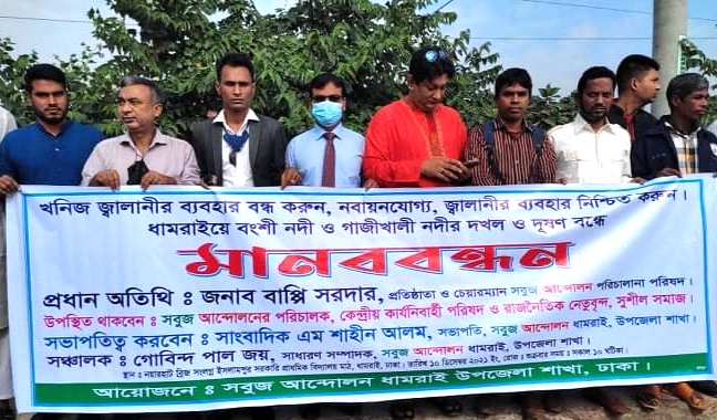 আয়োজিত মানববন্ধনে সবুজ আন্দোলন ধামরাই উপজেলা শাখা’র সভাপতি সাংবাদিক এম শাহীন আলমের সভাপতিত্বে এবং সাধারণ সম্পাদক গোবিন্দ পাল জয়ের সঞ্চালনায় প্রধান অতিথি হিসেবে উপস্থিত ছিলেন সবুজ আন্দোলন পরিচালনা পরিষদ এর প্রতিষ্ঠাতা ও চেয়ারম্যান বাপ্পি সরদার।