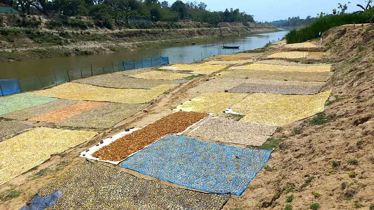 আঁকাবাঁকা বয়ে গেছে তুলসীগঙ্গা নদী। নদীর ধার ঘেঁষে ফাঁকা স্থান আর বাঁধ। ফাঁকা স্থান আর বাঁধের অনেক জায়গায় বড় বস্তা কিংবা জাল বিছিয়ে শুকানো হচ্ছে ঝুরি ঝুরি পাতলা করা আলু। এসব শুকানো আলু ভেজে তৈরি হচ্ছে চিপস। এ থেকেই অর্থ আয় করছেন অনেকে।