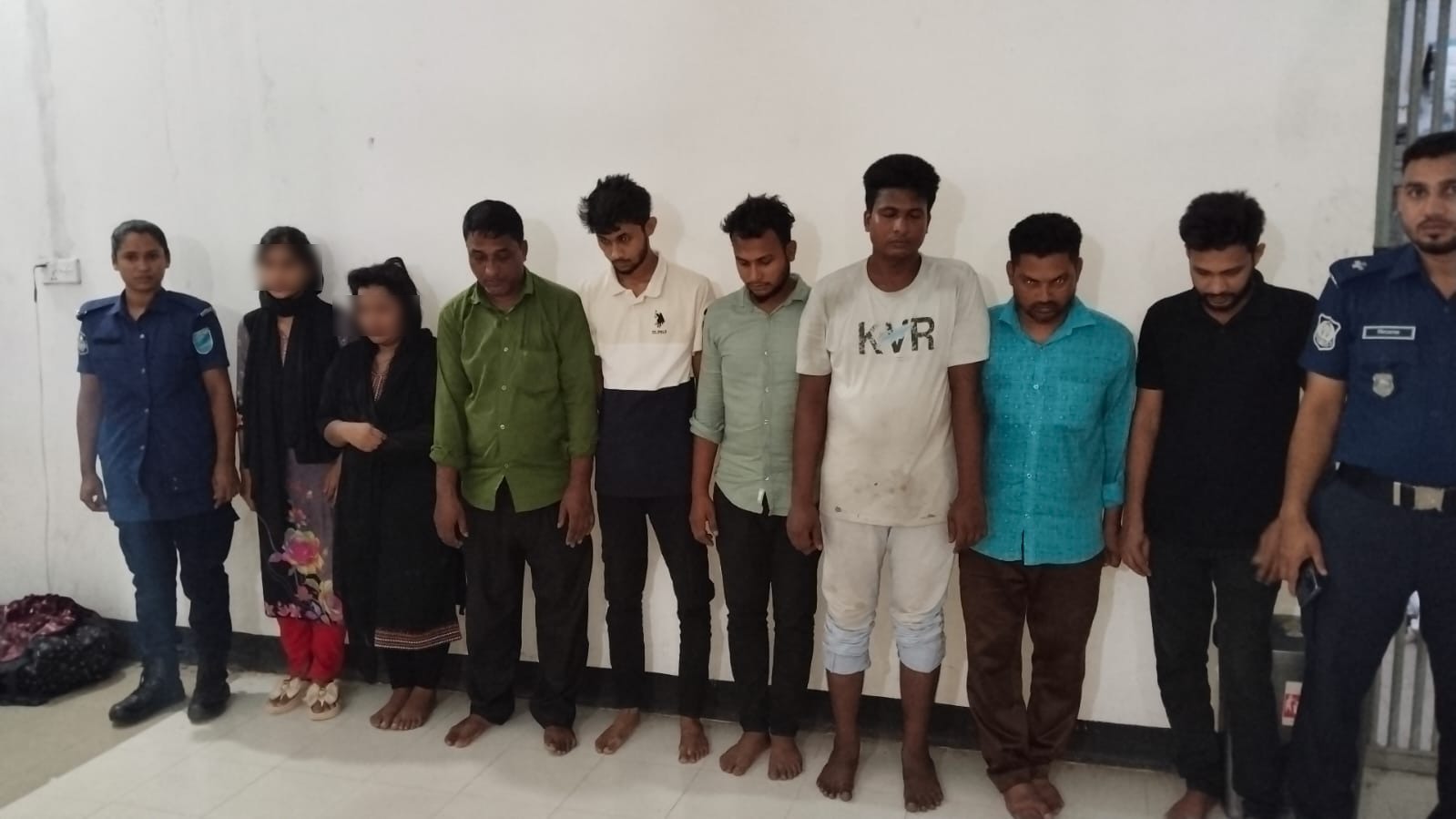আটককৃতরা হলো- আক্কাছ মিয়া ওরফে আলম (৪৮), মেহেদী হাসান অভি (২৫), নাজমুল হাসান জিসান (২৪), আবুল হোসেন (৪১), সুমন (২৫), জুলহাস (৩০), রাজমনি (১৯) ও সুমি আক্তার (২২)।